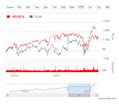 In addition to intraday and historical charting of your unique Custom Index, we also offer comparative charting to easily compare your Custom Index to indicators and indexes like the Dow Jones, NASDAQ, S&P 500, and so on.