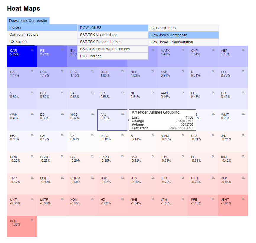 Give your users and site visitors an "at-a-glance" visual representation of how the markets are performing. Display any of the major indexes, arranging the constituent companies by color according to how their share prices are faring.