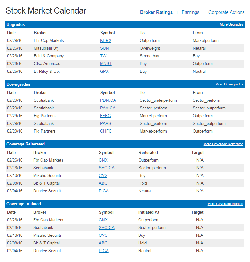 Corporate Events Calendars - Broker Ratings (Upgrades, Downgrades, Coverage Reiterated, Coverage Initiated) Earnings (Earnings Announcement Dates, Expectations, Performance and Surprises), and Corporate Actions (Splits, Dividends).