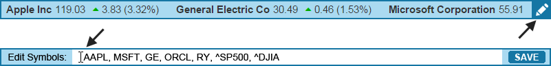Not only can you customize our tickers to match your site, you can also decide whether you would like to allow your users to control the symbols they see in the tickers. Much like our Watchlists, our user-editable tickers can be configured to allow site visitors to populate the tool with symbols of their own choosing. Their preferences are saved with cookies, so that they are shown their own personal scrolling ticker each time they return to your site. All of our tickers can be user-editable or non-user editable, it's up to you.