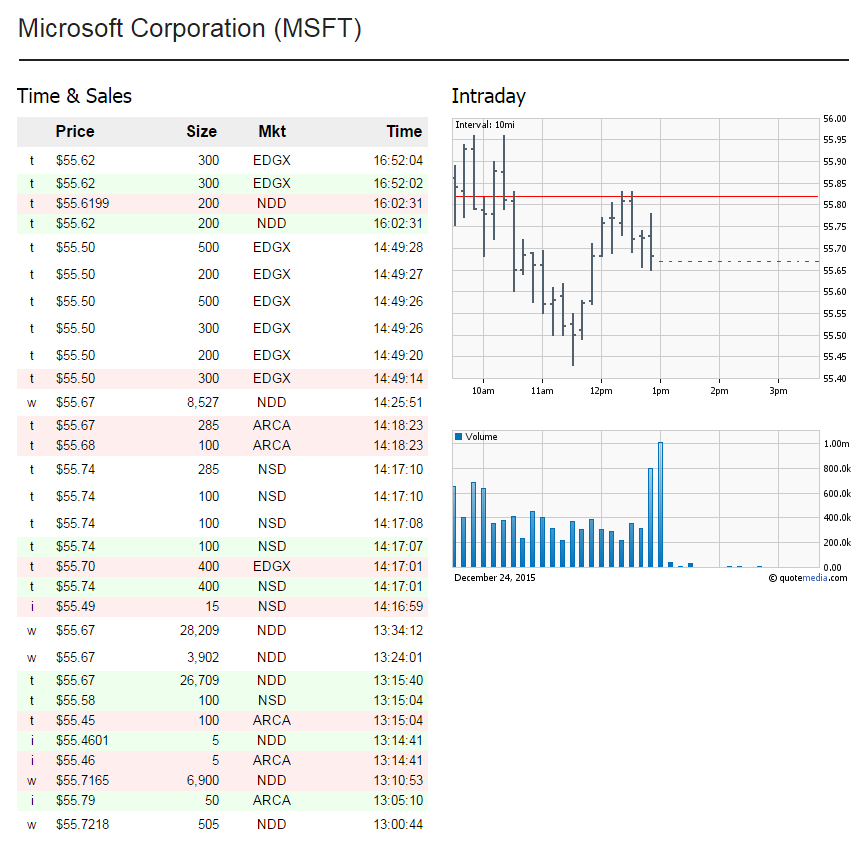 QuoteMedia's Trades, or Time and Sales applications provide visibility into every trade that occurs, along with the additional detailed information traders need, like Exact Time, Up or Down Tick, Price, Size of Order, Trade Type Indicators, and more.